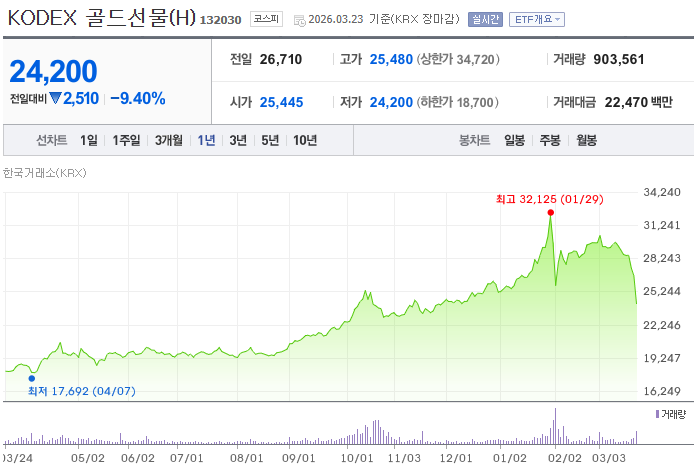 - KODEX 골드선물(H) / TIGER 골드선물(H): 국제 금 선물 가격을 추종합니다. 종목명 뒤에 붙은 '(H)'는 환헤지(Hedge)를 의미하며, 원/달러 환율 변동의 영향을 받지 않고 오직 '국제 금 가격'의 등락에만 수익률이 연동되도록 설계되어 있습니다.