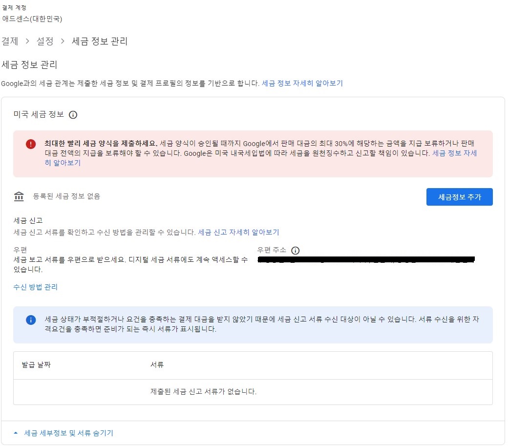 세금정보를 입력하지 않은 경우 위와 같은 화면이 나오게 됩니다. 세금 정보를 추가해야하는 것은 우측 '세금정보 추가' 버튼을 눌러 진행하실 수 있습니다.