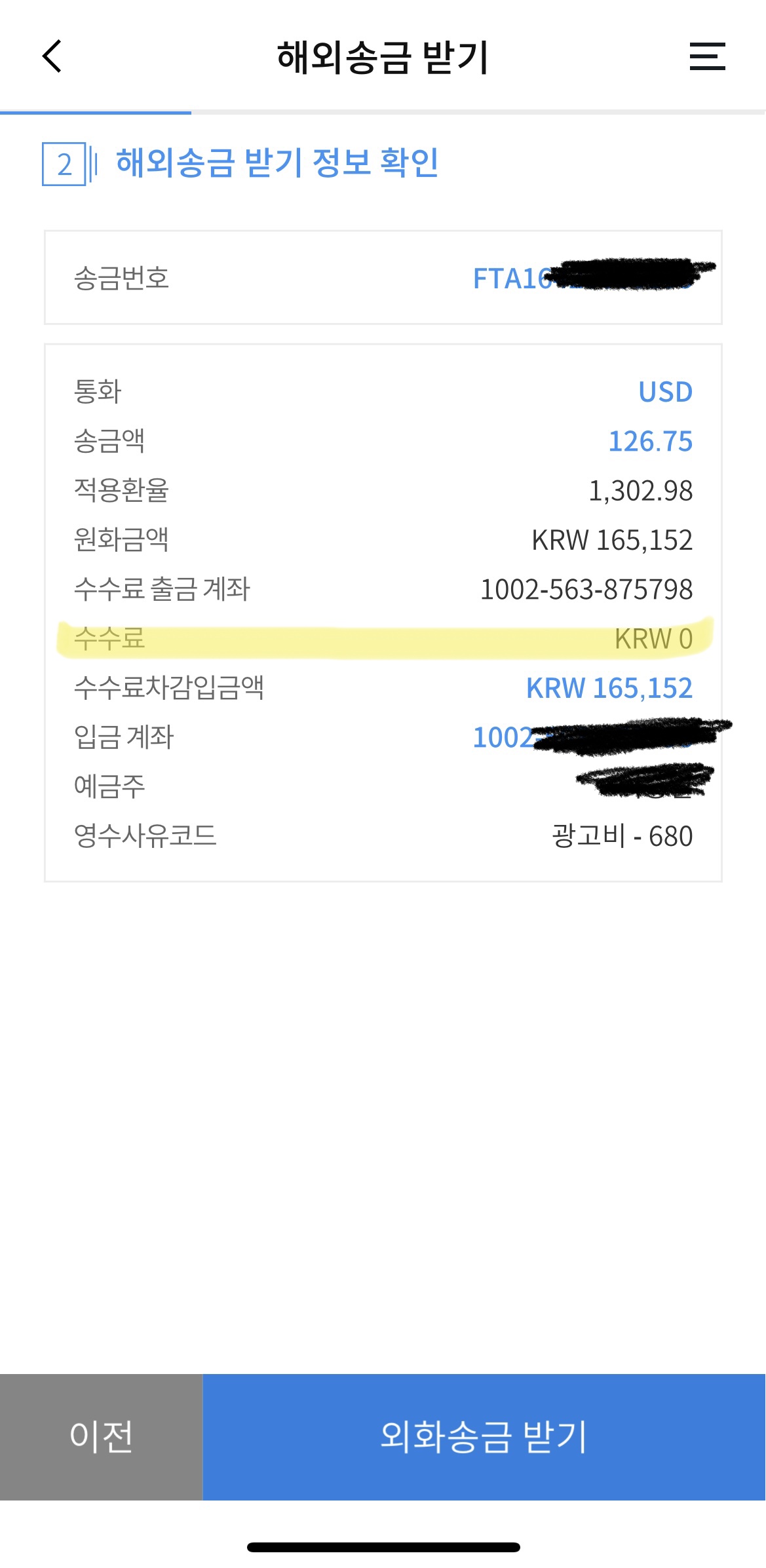 최종적으로 외화송금 받기를 클릭하시면 최종적으로 계좌에 입금이 완료됩니다. 우리은행 우리 크리에이터 우대 통장은 1년동안 수수료 우대를 받을 수 있어 송금받기 수수료는 무료입니다.(1년동안) 환율에 따라 수익금이 조금 변동될 수 있어서 요즘은 환율이 높았으면 좋겠다는 생각이 듭니다..ㅎㅎ