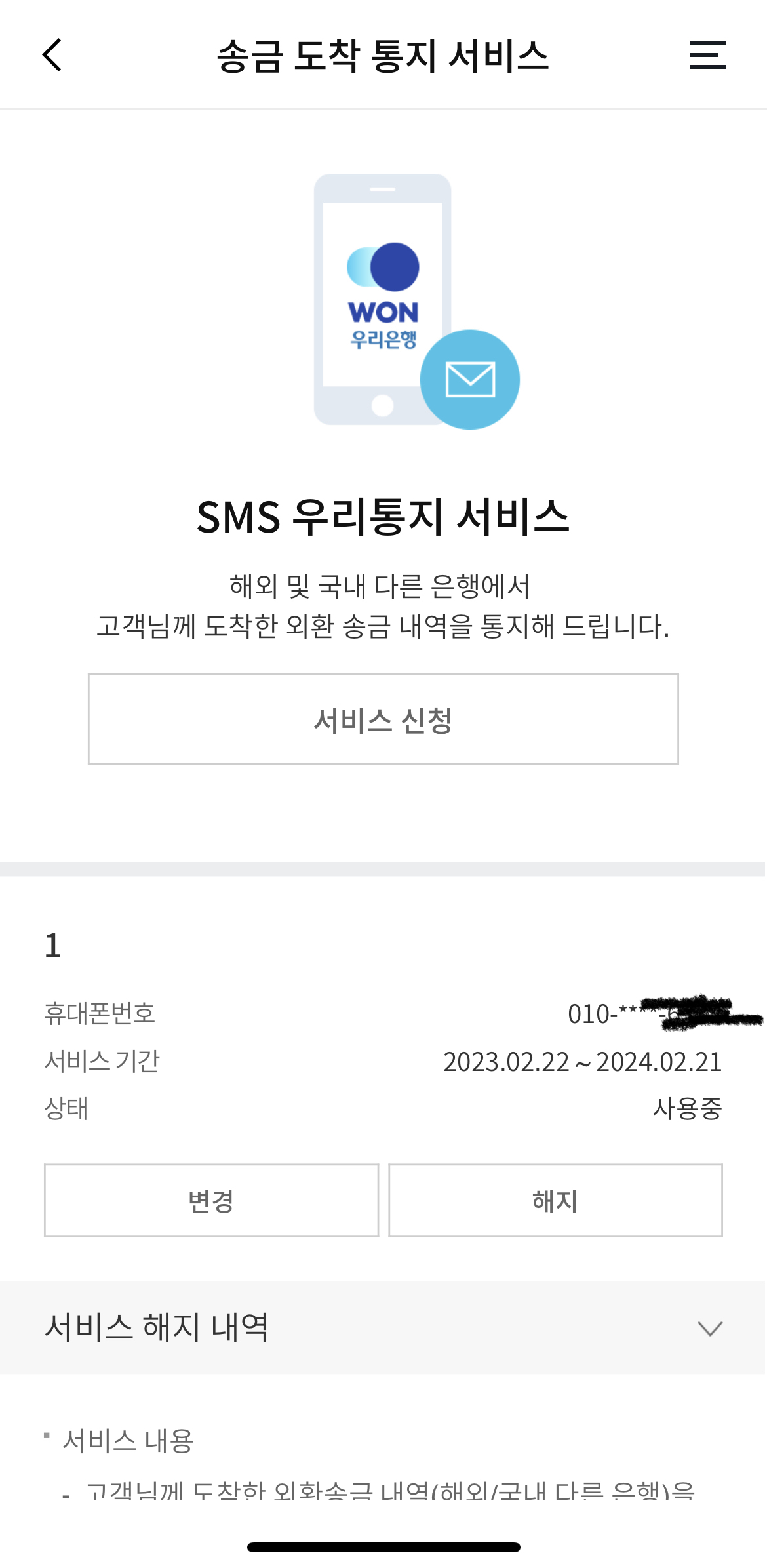 해외에서 누군가 이 계좌에 돈을 입금했을 때 알림을 해주는 서비스인데요. 해외에서 들어오는 돈은 바로 통장으로 들어오는 것이 아니라 해당 은행 직원이 직접 확인 후 고객에게 넘겨주는 시스템입니다. 이때 입금받는 고객은 입금한다고 확인까지 해야하죠! 휴대폰 인증을 하면 이렇게 1년동안 서비스가 신청됩니다.