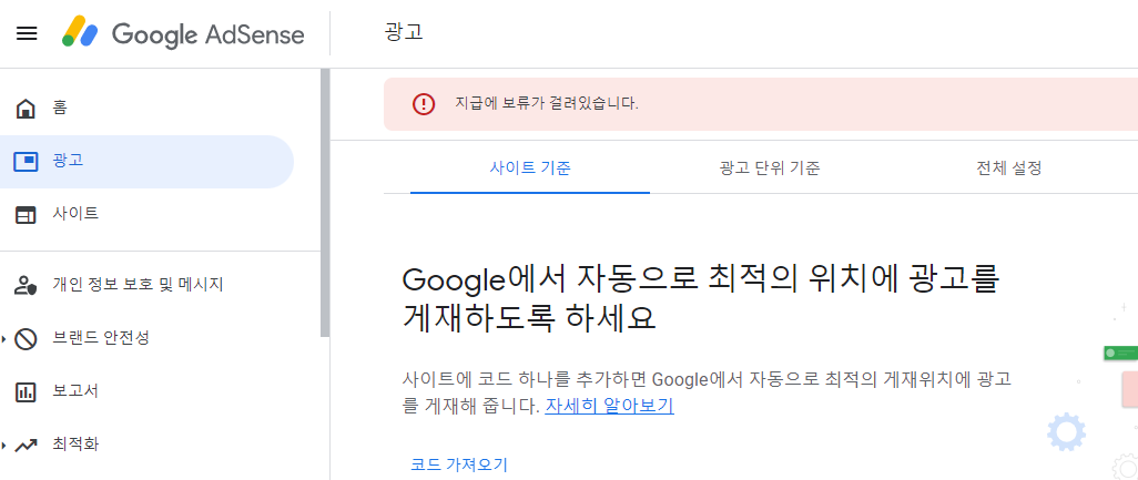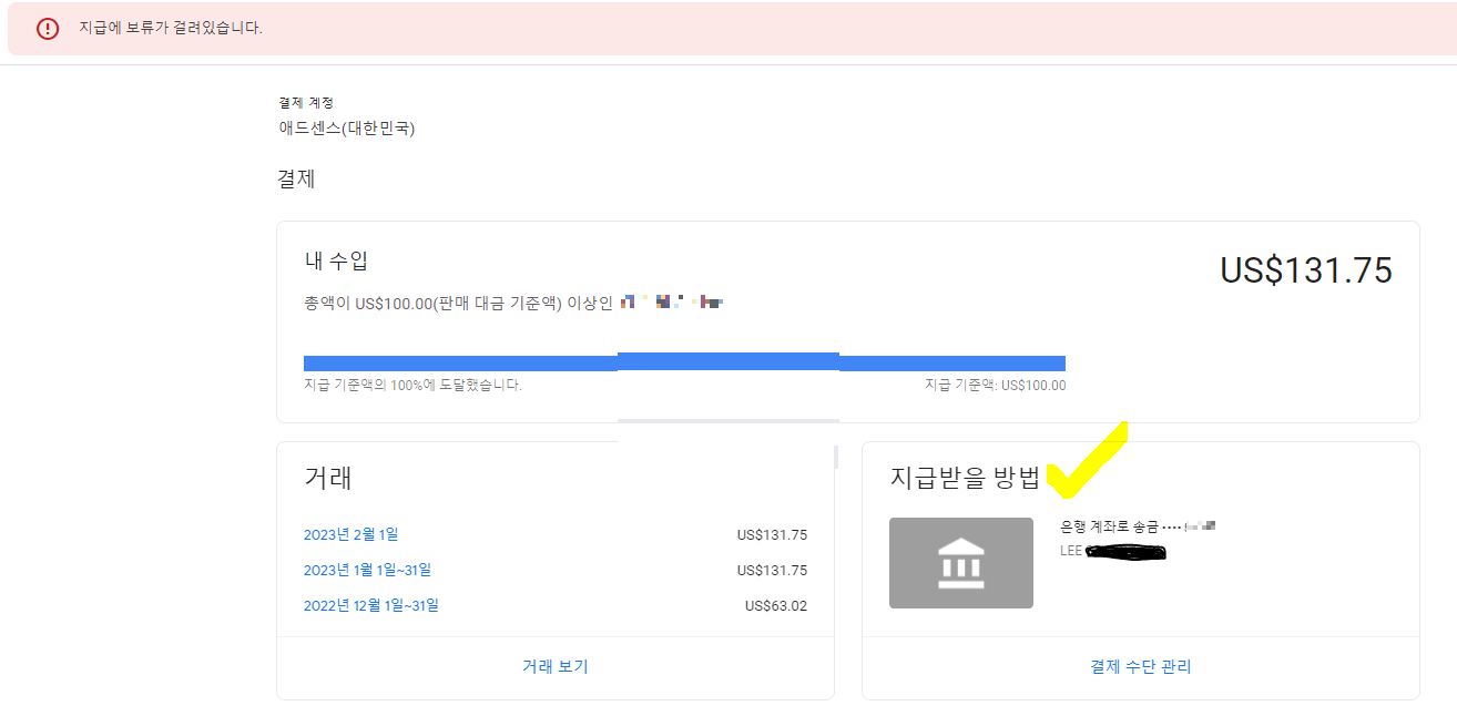 기본적으로 애드센스 설정은 수익이 $100를 넘게 되면 출금이 자동적으로 진행됩니다. 100달러 이상의 수익이 났음에도 불구하고 계좌가 등록되어있지 않은 경우 위처럼 지급에 보류가 걸리게 됩니다.