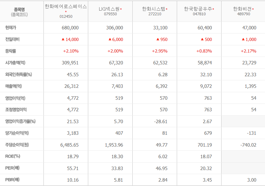 시가 총액과 매출액으로만 비교한다면 현재 수준의 주가는 넥스원과 유사한 수준으로 확인되는데 영업이익으로 보면 주가가 고평가되었다고 보기는 어려울 것으로 보여집니다.